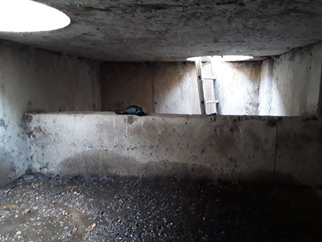 Voorbeeld van een volledig overdekt overstort: toegangsdeksel (boven), zicht van binnen in de put (linksonder) en een geïnstalleerde sensor (rechtsonder).